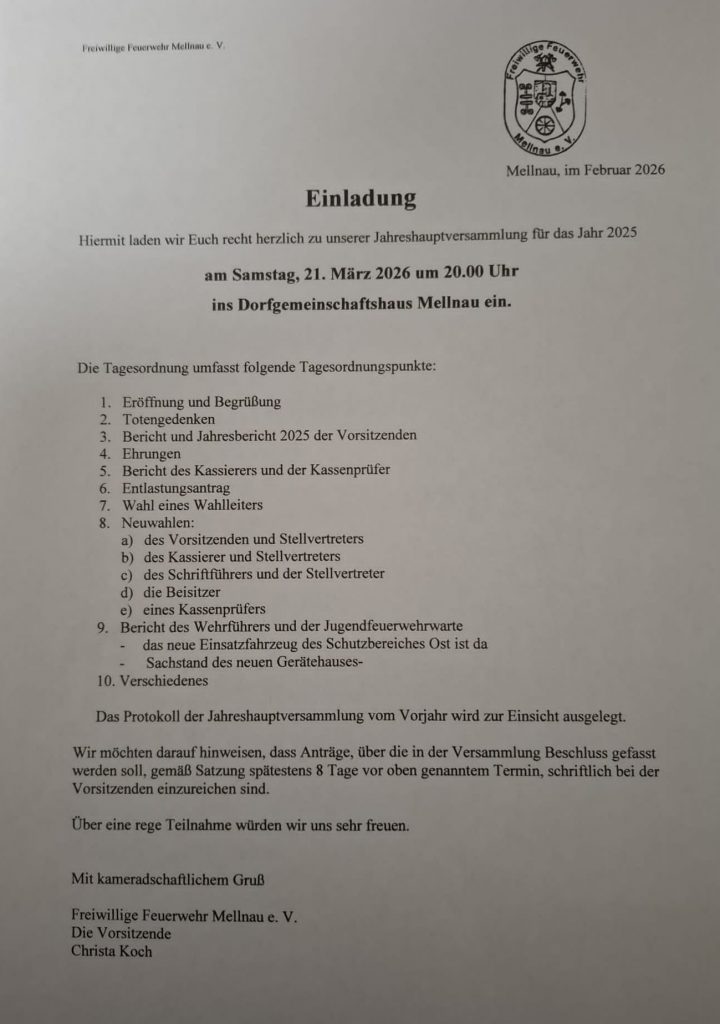 Feuerwehr: Jahreshauptversammlung "Feuerwehr: Jahreshauptversammlung" 21 März, 2026, 20:00 Uhr bis 22:30 Uhr Veranstaltungsort: Bürgerhaus Mellnau Burgstraße 42 35083 Wetter-Mellnau Weitere Informationen: Parkempfehlung: Direkt am Haus.